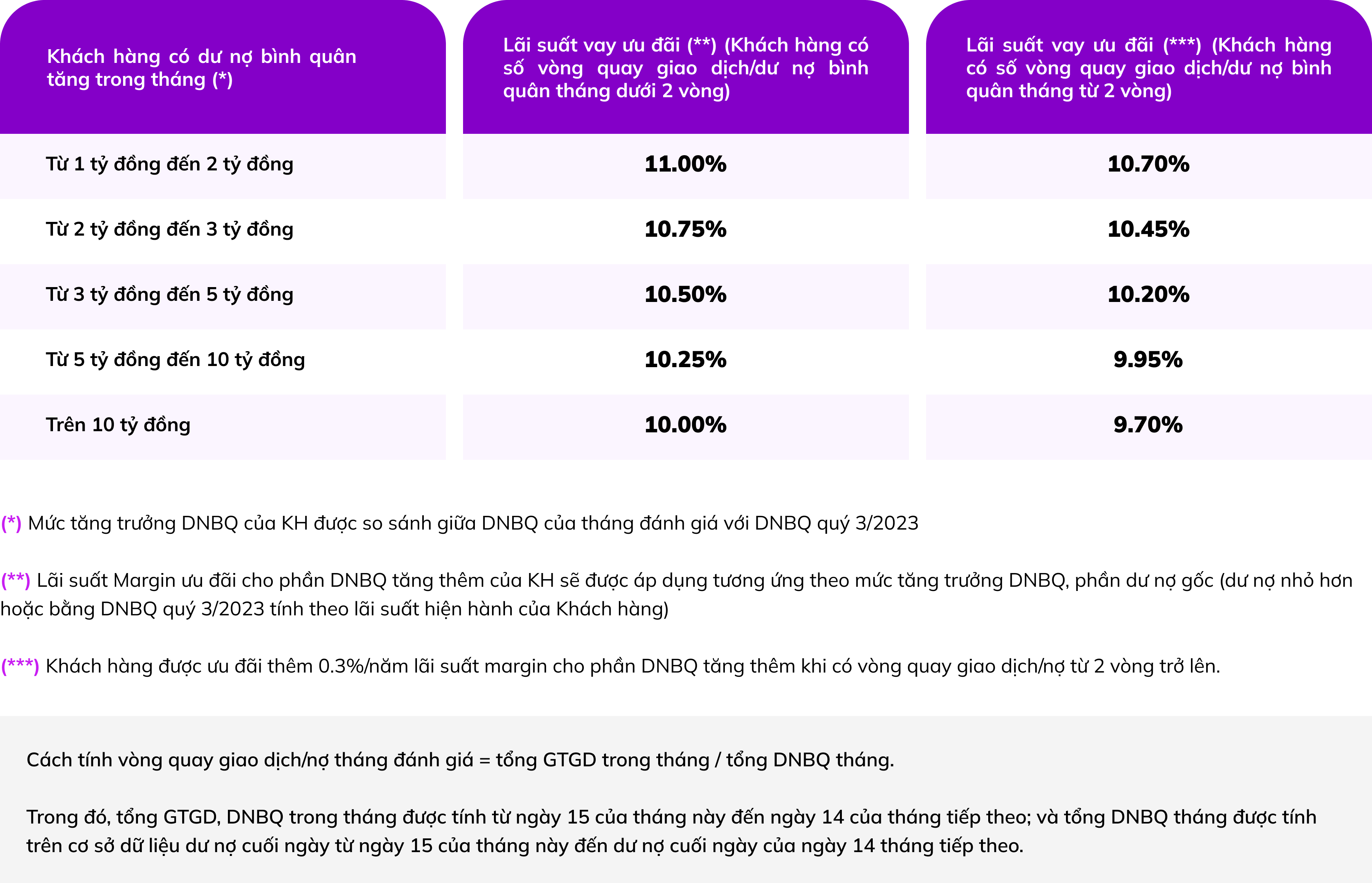 Lãi suất ưu đãi: từ 9.7% – 11% cho KH có tăng trưởng Dư nợ bình quân tháng đạt điều kiện*