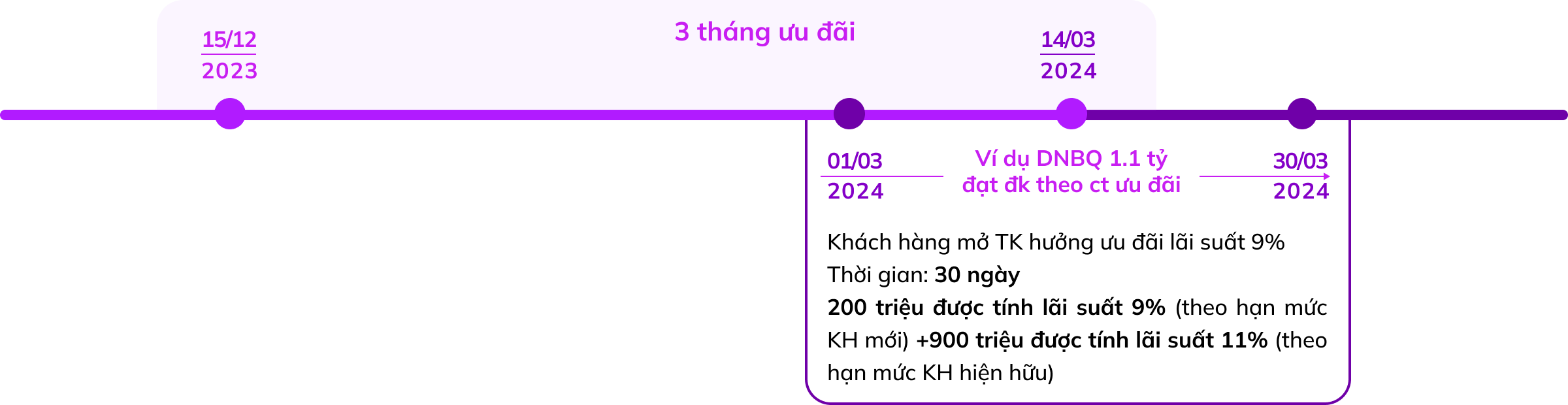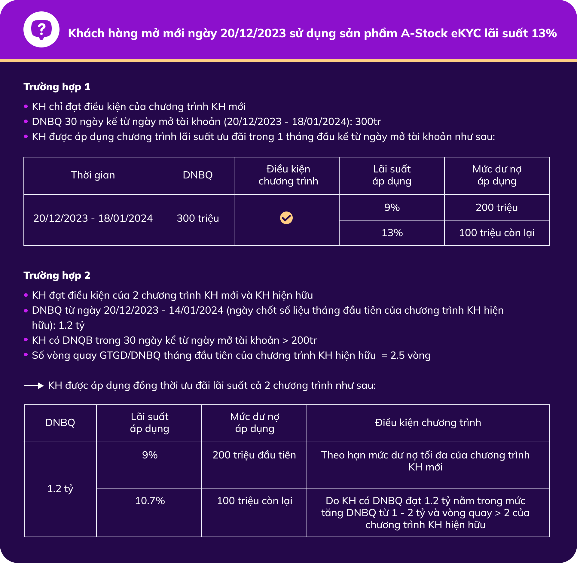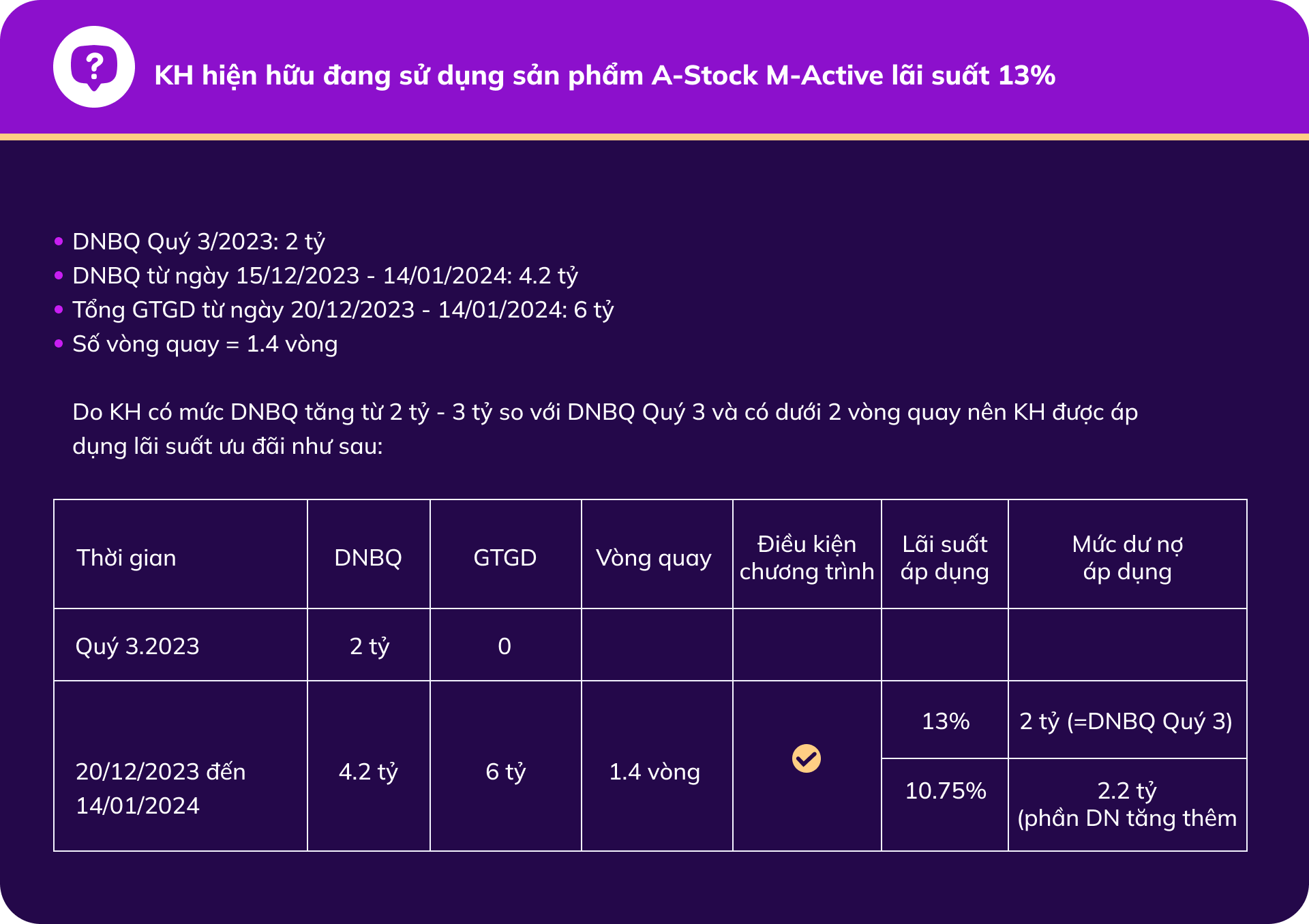 – Chương trình dành cho Khách hàng hiện hữu: tùy thuộc vào dư nợ bình quân của Quý Khách từ ngày 10/03/2024 ( ngày mở tài khoản) đến ngày 14/03/2023 (ngày chốt số liệu). Nếu Quý Khách có dư nợ bình quân từ 1 tỷ thì được áp lãi suất ưu đãi như bảng lãi suất của chương trình.